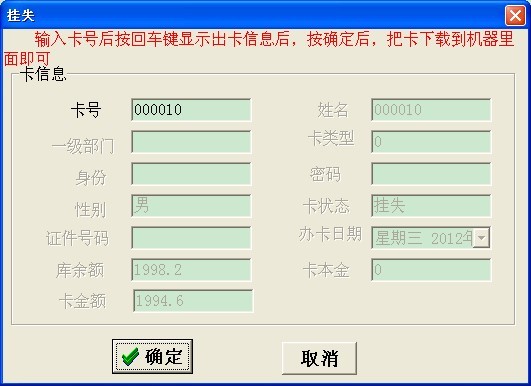 補卡操作的第一步:將丟失的卡進行掛式,在軟件卡管理——卡掛失,輸入要掛失的卡號,然后按回車鍵,出現卡的基本信息后,點擊確定鍵(如圖一)