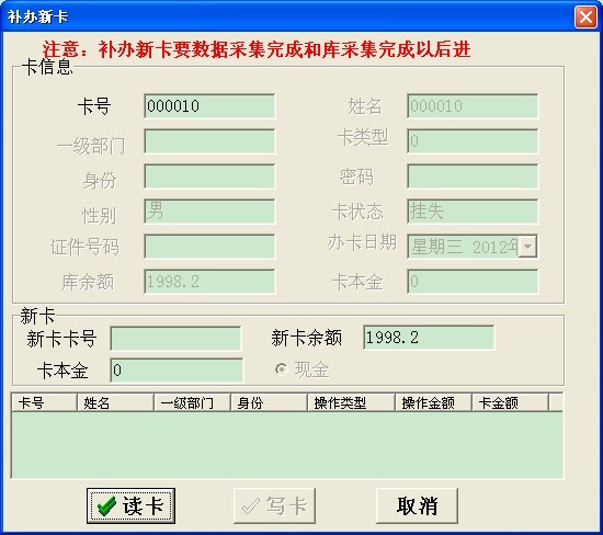 第三步:將一張未發行過的卡放到讀卡器上,在軟件卡管理——補辦新卡,在出現的界面中輸入要補辦的卡的卡號,然后按回車鍵, 在出現丟失卡的卡信息后,點擊讀卡,寫卡,這張新卡就將原來的卡補辦了!(如圖二)