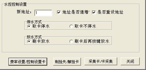 2 水控控制設(shè)置:新地址設(shè)置為1,把地址號是否遞增和是否重設(shè)機器號前面的選項選上,如下圖所示,點擊費率設(shè)置|控制設(shè)置卡按鈕,點擊控制設(shè)置卡, 即可成功制作成控制設(shè)置卡去修改聯(lián)網(wǎng)型水控一體機的機器號。控制設(shè)置卡在機器上數(shù)卡成功時會提示8 OK 9 OK 10 OK