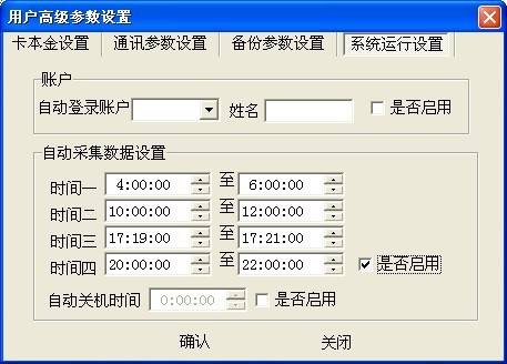 485一卡通軟件可以設置消費數據定時采集,如下圖所示,在用戶高級參數設置-系統運行設置中有一個自動采集數據設置,最多可以設置四個自動采集的時間段,時間段設置時不能跨天,且后一個時間段的開始時間不能大于前一時間段的結束時間,設置完成后勾選上是否啟用,點擊確認即可,如果沒有勾選上是否啟用,代表自動采集數據設置不起作用。