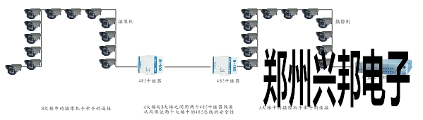 施工方采用485中繼器解決上述問題。在AB教學(xué)樓里面各放一個(gè)485中繼器,等于把一個(gè)485網(wǎng)絡(luò)分成了3個(gè)485網(wǎng)絡(luò),這樣485網(wǎng)絡(luò)就可以很穩(wěn)定的運(yùn)行。再由于教學(xué)樓之間的200m的距離是在兩個(gè)485中繼器中間,即使有強(qiáng)電干擾,由于485中繼器中防雷保護(hù)和光隔離功能,也會被其所吸收,隔離。從而保證了485網(wǎng)絡(luò)的穩(wěn)定性及安全性。