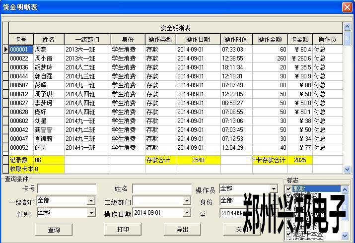 2、要是想要知道操作員收入和支出的名細,就要在資金明細表里查看的。數據管理--資金明細表。這里可以選擇存款,取款,開戶,退款都可以查到。