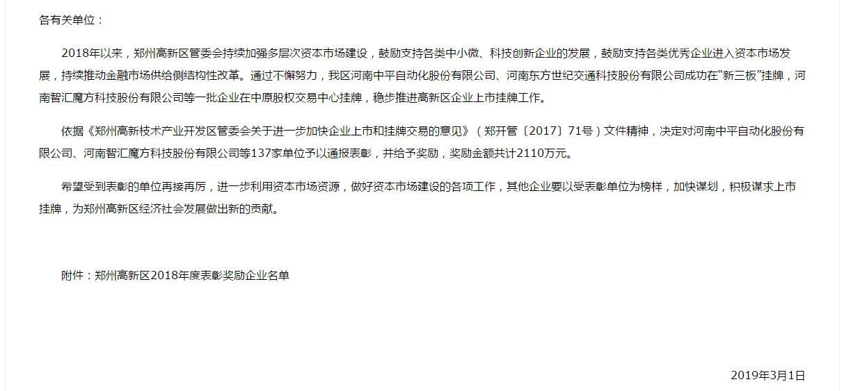 [文章內容簡介]:轉發:鄭州高新技術產業開發區管委會關于表彰鄭州高新區2018年度多層次資本市場企業的決定